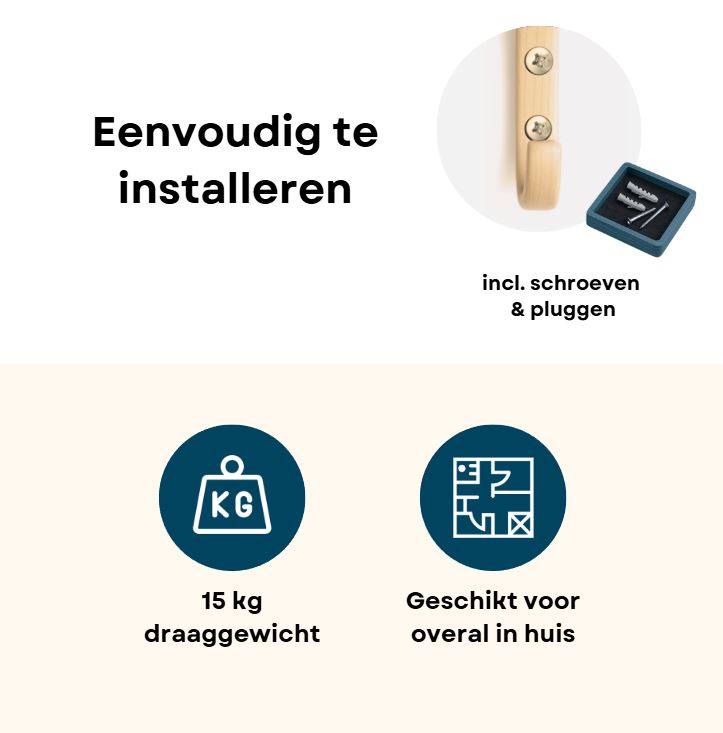 Dankzij de meegeleverde schroeven en pluggen zijn ze eenvoudig te installeren, waardoor je ze snel op de gewenste plek kunt bevestigen. Ondanks hun verfijnde uitstraling zijn ze verrassend robuust en kunnen ze tot wel 15 kg dragen. Gemaakt van massief hout, bieden de haken niet alleen duurzaamheid maar ook een natuurlijke charme, met elk stuk hout dat uniek is door de eigen nerf en hoogwaardige afwerking.